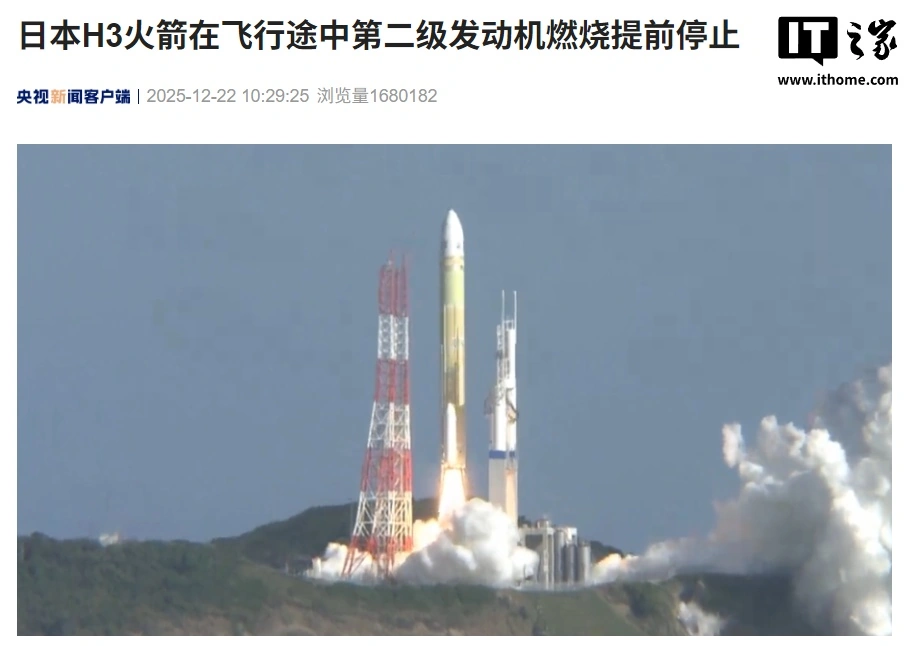 IT之家12月22日消息,据央视新闻报道,日本文部科学省今日天发布消息称,H3火箭8号机发射失败,火箭上搭载的卫星未能进入预定轨道。