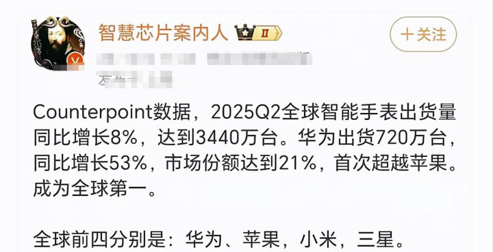 Counterpoint数据出炉,估计让很多人大跌眼镜:华为智能手表市场份额21%登顶全球第一,而苹果却跌到了17%!