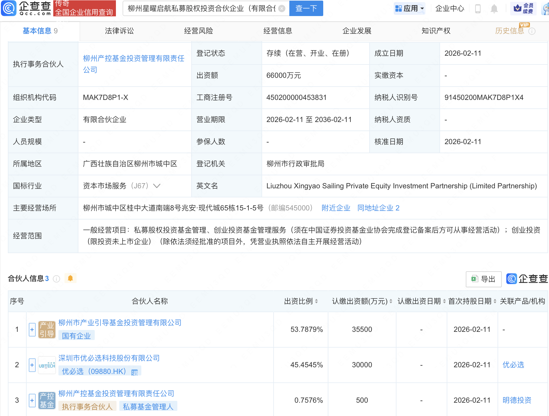 近日,柳州星曜启航私募股权投资合伙企业(有限合伙)成立,出资额6.6亿元,经营范围包含:私募股权投资基金管理、创业投资基金管理服务;创业投资(限投资未上市企业)。企查查股权穿透显示,该企业由优必选(09880.HK)等共同出资。