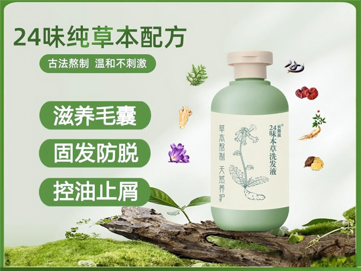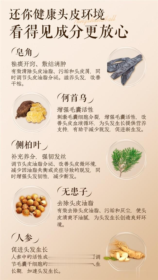 产品采用纯正本草古法,不添加任何硅油、酒精、香精、色素及调理剂,拒绝激素和有害物质,特别适合敏感头皮人群。配方集合灵芝、人参、何首乌、侧柏、生姜等核心药材,不仅能温和调理发丝,而且兼顾固发、乌发、改善掉发和头皮油腻、头屑困扰等多重诉求。